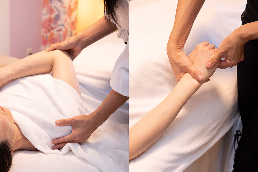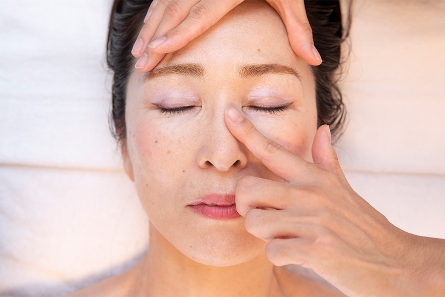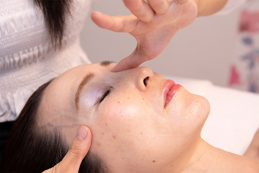 中顔面をキュッと持ち上げる「中顔面短縮セラピー」で小顔効果を、疲れやすい腕や手からアプローチして胸上から顔まで引き上げる「アーム&ハンドフェイスリフト」、そして筋膜の歪みをアイロンのように整える「筋膜アイロニング」。